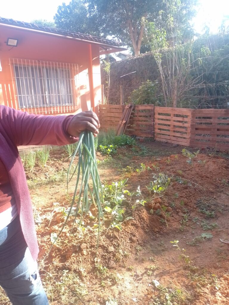 Foto 1: Brotos de cebolinha sendo colhidos na horta da Associação Pestalozzi. Crédito/ Imagem: Associação Pestalozzi de Atílio Vivacqua.